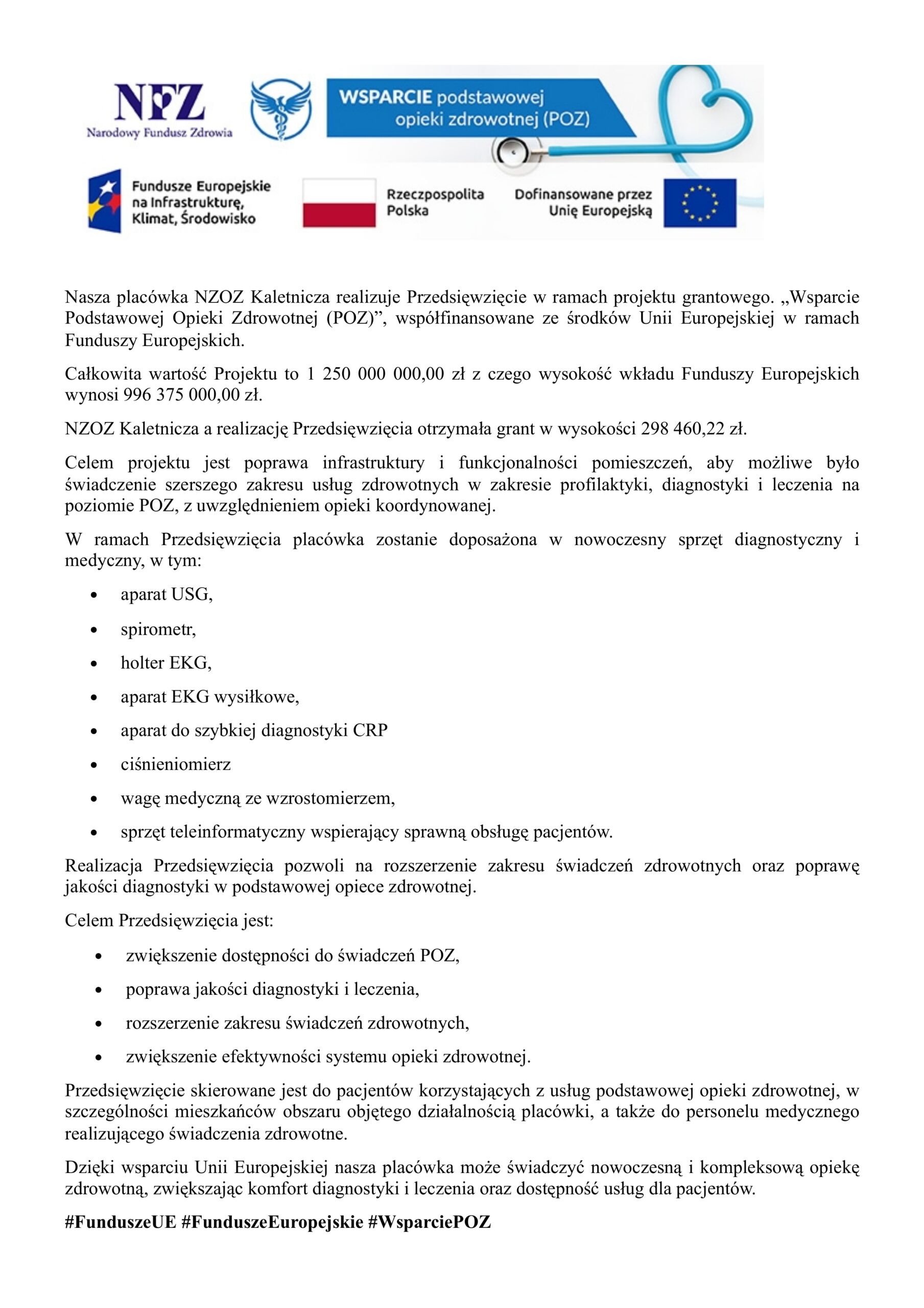 Roztrzygnięcie postępowaniana projektu wsparcia POZ FEnIKS na zakup:Na zakup i dostawę Aparat EKG oraz Holter EKG